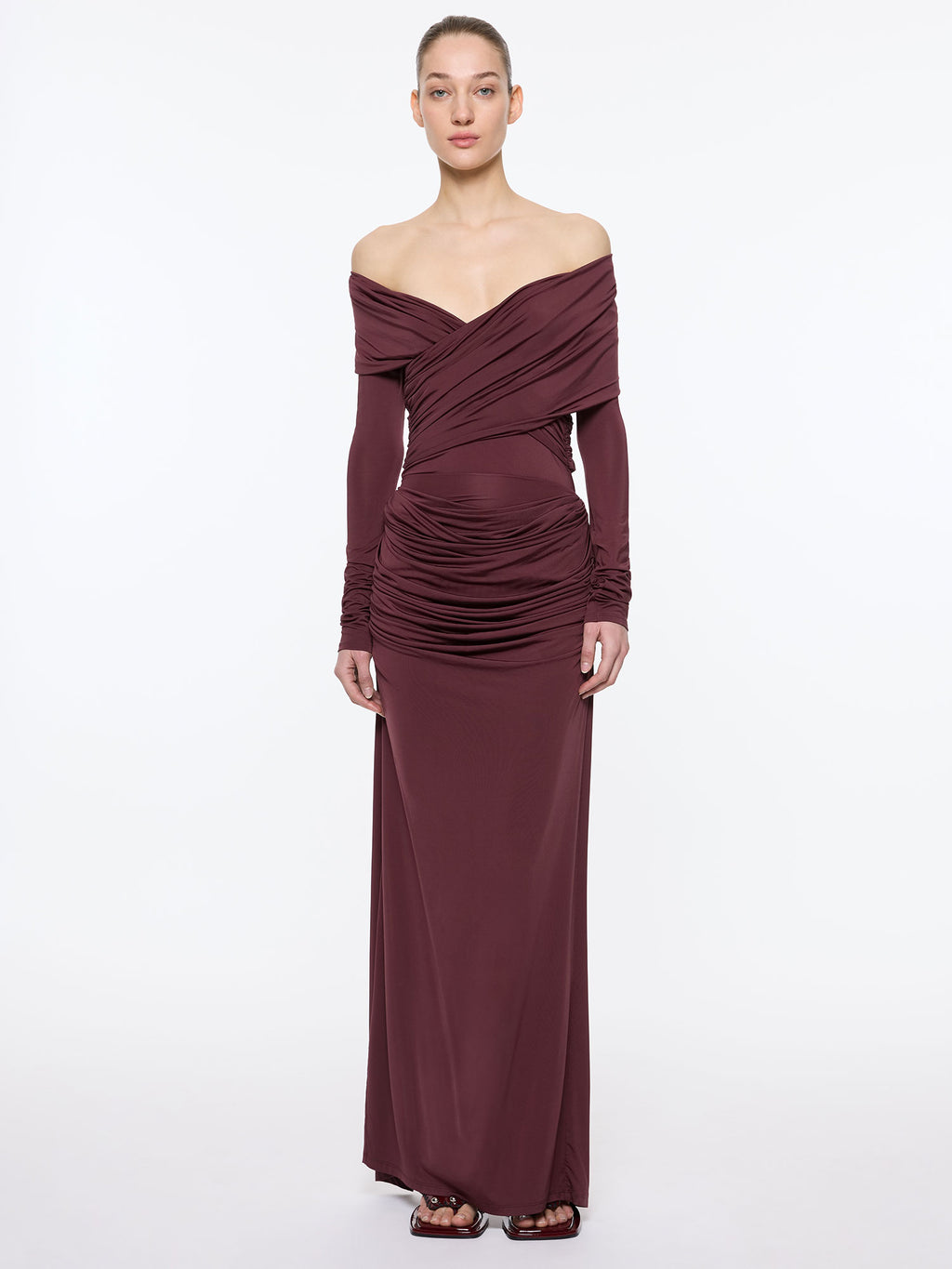 Our Val Dress, crafted from our signature Elevated Jersey fabrication, features a wire structure creating a keyhole neckline with soft gathering throughout the bodice. Designed to contour the body, the silhouette falls into a fluid full-length skirt with subtle draping for an effortlessly refined finish.